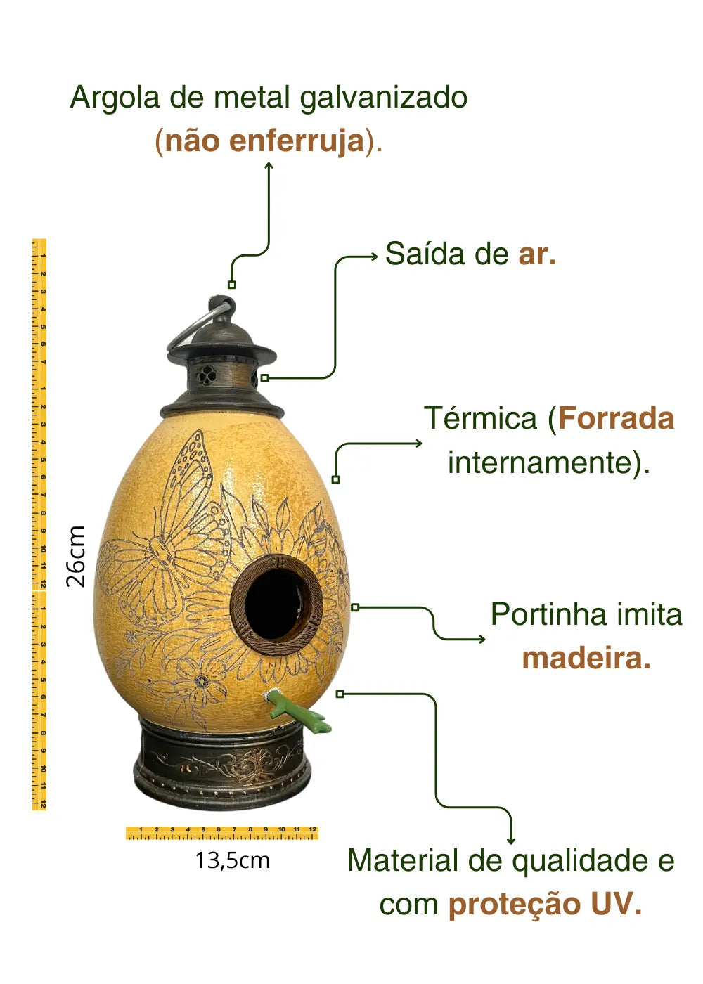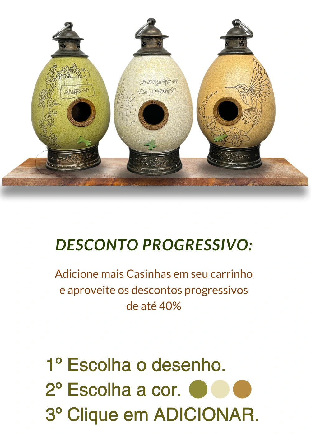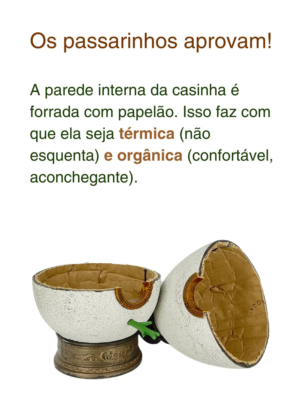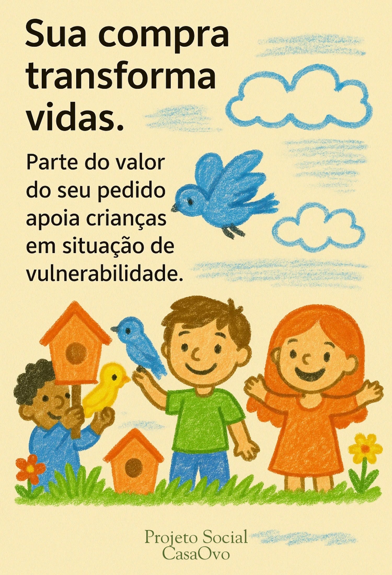 Mais do que um produto artesanal e sustentável, você leva a certeza de que sua compra tem um propósito maior. Cada CasaOvo se transforma em acolhimento para os pássaros — e em esperança para as crianças.